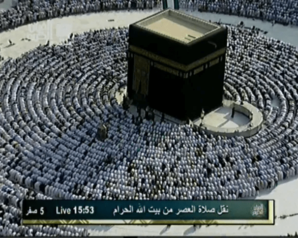 لوگ اللہ کا نام لیتے ہوئے کعبہ کا طواف کرتے ہیں۔